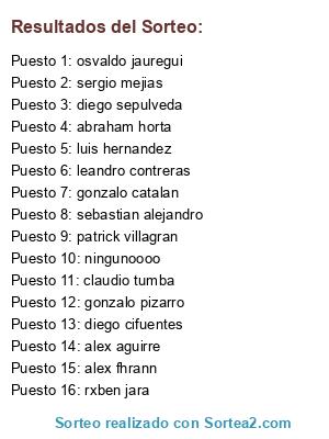 Lista de participantes: alex fhrann, sebastian alejandro, sergio mejias, rxben jara, diego cifuentes, ningunoooo, diego sepulveda, alex aguirre, osvaldo jauregui, claudio tumba, gonzalo catalan, leandro contreras, gonzalo pizarro, luis hernandez, patrick villagran, abraham horta.