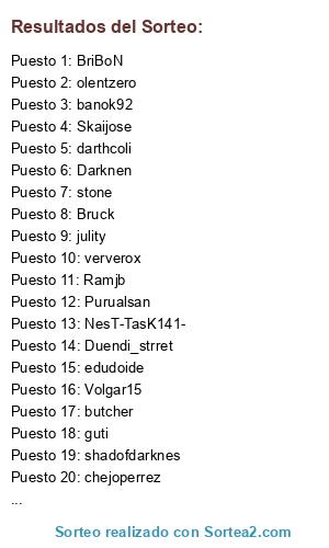 Lista de participantes: xokero, Skaijose, stone, guti, poty20, edudoide, pelcom, olentzero, Bruck, Dalex, Darknen, NesT-TasK141-, ververox, Duendi_strret, shadofdarknes, butcher, Volgar15, julity, Purualsan, darthcoli, chejoperrez, Ramjb, banok92, BriBoN.