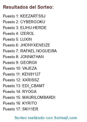 Lista de participantes: EDI_CBAMT, GEORGII, JHONYXENEIZE, JONNATHAN, KEEZARTSSJ, KEN91127, KYRITO, MAURILOMBARDI, RAFAEL NOGUEIRA, RYOGA, ELIHU-HERDE, LUXIN, VAJEZA, SKI11ER, CYBERGOKU, XXRISSZ, IZEROL.