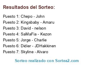 Lista de participantes: Didier - JDHakkinen, Chepo - John, Jorge - Charlie, Kingsbaby - Amaru, SaMaFia - Kezon, Skyline - Alvaro, David - nelson.