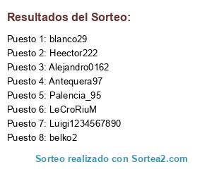 Lista de participantes: Antequera97, belko2, Palencia_95, blanco29, Luigi1234567890, LeCroRiuM, Heector222, Alejandro0162.