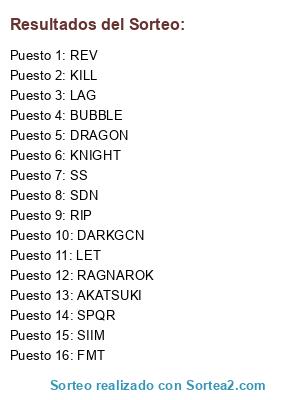 Lista de participantes: KNIGHT, FMT, RAGNAROK, SIIM, LET, RIP, SS, BUBBLE, AKATSUKI, SDN, DRAGON, KILL, SPQR, DARKGCN, LAG, REV.