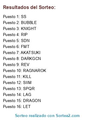 Lista de participantes: REV, KILL, LAG, BUBBLE, DRAGON, KNIGHT, SS, SDN, RIP, DARKGCN, LET, RAGNAROK, AKATSUKI, SPQR, SIIM, FMT.