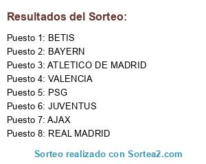 Lista de participantes: ATLETICO DE MADRID, VALENCIA, PSG, JUVENTUS, BETIS, BAYERN, AJAX, REAL MADRID.