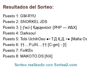 Lista de participantes: Tobi UchihOso ●•·T.Д.Қ.Д.·•● [Mafia Osuna], GM-RYU, FolKEn, [-ƒмJ-] Қąқąsнizєτ [ЯЧP — ИΔX], SNORKEL JDS, MAKOTO.DS [NX], ††....P∆IN....†† [C-gm] - [I], Darksoul.