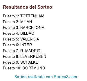 Lista de participantes: BILBAO, VALENCIA, INTER, LEVERKUSEN, TOTTENHAM, MILAN, R. MADRID, DORTMUND, BARCELONA, SCHALKE.