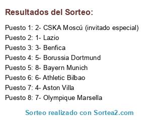 Lista de participantes: 1- Lazio, 2- CSKA Moscú (invitado especial), 3- Benfica, 4- Aston Villa, 5- Borussia Dortmund, 6- Athletic Bilbao, 7- Olympique Marsella, 8- Bayern Munich.
