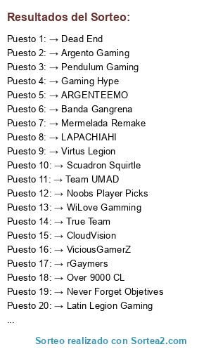 Lista de participantes: → rGaymers, → Banda Gangrena, → Gaming Hype, → Noobs Player Picks, → FastMauz cL, → True Team, → Bankai Team, → Argento Gaming, → Nex Sacramentum, → Mermelada Remake, → Team UMAD, → Dead End, → p8, → ReaL GAMES, → Virtus Legion, → Pendulum Gaming, → Scuadron Squirtle, → Never Forget Objetives, → ARGENTEEMO, → WiLove Gamming, → ViciousGamerZ, → CloudVision, → Latin Legion Gaming, → LAPACHIAHI, → Over 9000 CL.