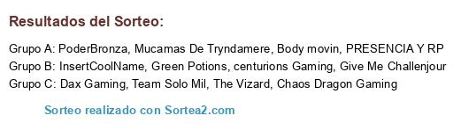 Lista de participantes: PoderBronza, PRESENCIA Y RP, Team Solo Mil, The Vizard, InsertCoolName, centurions Gaming, Give Me Challenjour, Green Potions, Mucamas De Tryndamere, Dax Gaming, Body movin, Chaos Dragon Gaming.