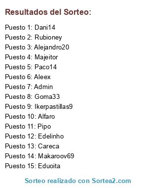 Lista de participantes: Admin, Ikerpastillas9, Rubioney, Alejandro20, Goma33, Edelinho, Aleex, Alfaro, Careca, Makaroov69, Eduoita, Paco14, Majeitor, Dani14, Pipo.