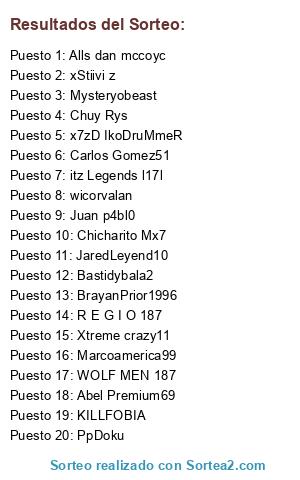 Lista de participantes: Chuy Rys, Chicharito Mx7, JaredLeyend10, Xtreme crazy11, itz Legends l17l, Alls dan mccoyc, Abel Premium69, wicorvalan, KILLFOBIA, BrayanPrior1996, Carlos Gomez51, Mysteryobeast, Juan p4bl0, x7zD IkoDruMmeR, R E G I O 187, xStiivi z, Marcoamerica99, WOLF MEN 187, Bastidybala2, PpDoku.