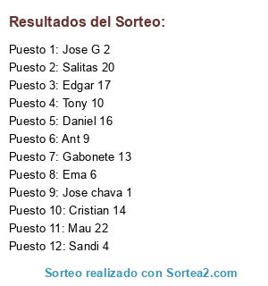 Lista de participantes: Jose chava 1, Jose G 2, Fabian 3, Sandi 4, Ale sandi 5, Ema 6, Josh 7, Pelon 8, Ant 9, Tony 10, Javier 11, Michael 12, Gabonete 13, Cristian 14, Control 15, Daniel 16, Edgar 17, Heber 18, Irwing 19, Salitas 20, Carlos 21, Mau 22.