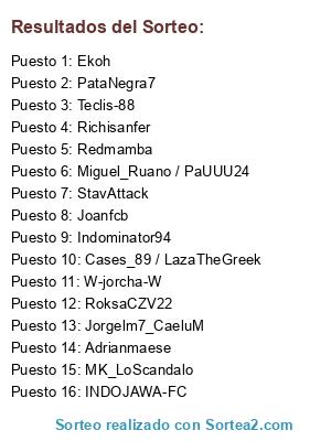 Lista de participantes: Teclis-88, Redmamba, Ekoh, StavAttack, Richisanfer, Jorgelm7_CaeluM, PataNegra7, Joanfcb, W-jorcha-W, INDOJAWA-FC, MK_LoScandalo, RoksaCZV22, Miguel_Ruano / PaUUU24, Cases_89 / LazaTheGreek, Indominator94, Adrianmaese.