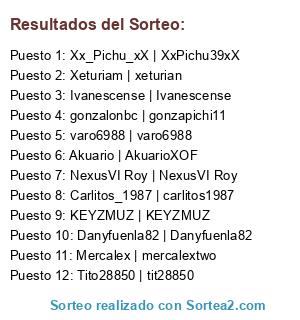 Lista de participantes: NexusVI Roy | NexusVI Roy, Tito28850 | tit28850, Xx_Pichu_xX | XxPichu39xX, varo6988 | varo6988, Akuario | AkuarioXOF, KEYZMUZ | KEYZMUZ, gonzalonbc | gonzapichi11, Xeturiam | xeturian, Mercalex | mercalextwo, Ivanescense | Ivanescense, Carlitos_1987 | carlitos1987, Danyfuenla82 | Danyfuenla82.