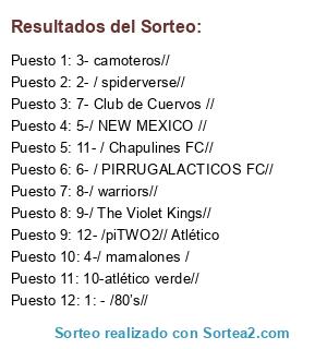 Lista de participantes: 1: - /80’s//, 2- / spiderverse//, 3- camoteros//, 4-/ mamalones /, 5-/ NEW MEXICO //, 6- / PIRRUGALACTICOS FC//, 7- Club de Cuervos //, 8-/ warriors//, 9-/ The Violet Kings//, 10-atlético verde//, 11- / Chapulines FC//, 12- /piTWO2// Atlético.