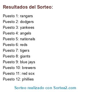 Lista de participantes: red sox, giants, yankees, dodgers, rangers, nationals, tigers, brewers, angels, phillies, blue jays, reds.