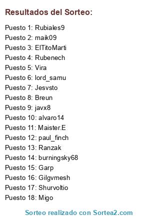 Lista de participantes: maik09, paul_finch, Shurvoltio, Garp, Gilgvmesh, Migo, Rubenech, Vira, ElTitoMarti, Breun, Rubiales9, alvaro14, Jesvsto, Ranzak, Maister.E, burningsky68, javx8, lord_samu.