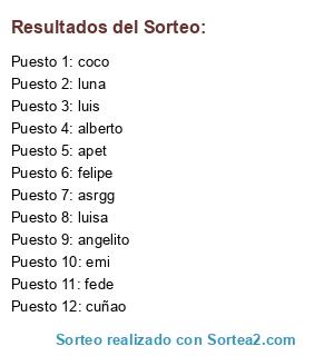 Lista de participantes: luis, luisa, felipe, cuñao, angelito, luna, coco, alberto, apet, emi, fede, asrgg.