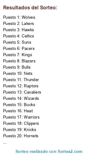 Lista de participantes: Celtics, Nets, Knicks, 76ers, Raptors, Bulls, Cavaliers, Pistons, Pacers, Bucks, Hawks, Hornets, Heat, Magic, Wizards, Nuggets, Wolves, Thunder, Blazers, Jazz, Warriors, Clippers, Lakers, Suns, Kings, Mavericks, Rockets, Grizzlies, Pelicans, Spurs.