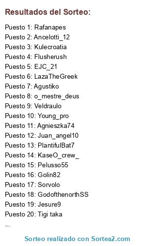 Lista de participantes: Mrsufi_2011, Shule106, Veldraulo, Kvothe_the_hero, Zeusinjo, Arranz_83_, Pipol-Imperador, Labestianegra10, M1n3ro, Agnieszka74, Richisanfer, FerVilla9, Cases_89, LazaTheGreek, Kailovic, Farbax, AlonsoGrayFox, Sesagol7, G66physis666, Pelusso55, Abrahamm0726, Anquiher, Fantastico-1, B10_Joker, JoseTheCatalyst, Soto___11, Davosss__, Jorgelm7, KaseO_crew_, Lakylu, maskyrojillo, Jerasxs, Sheriffchenko, Kamisama_1095, Twisterswar, Kulecroatia, Agustiko, Sem19071986, PaUUU24, Boixos_nois186, Victorjg11, F4r40n, Barlica_churros, Agresivo100, Hectoryenzo, Troyanitooo999, Teclis-88, Javitri, Ekoh, ReDerHugo, Ferran8r, Dominho3, Fer_Don3p, Jesure9, Amortee, Tachin_6, GodofthenorthSS, Mauritoqv, Redmamba, Young_pro, Catarino_AO, C4ristian, Flusherush, Angelete_7, Pastrakas, o_mestre_deus, Selinichev, Danii_sniper8, PlantifulBat7, SORAK_PRO, Golin82, Fabrizioahah, Jonis27, MAFVFC, Mehman, Diepzalig11, Ju20no, JC_STUNNER_90, Messi_jerezano, Juan_angel10, DAMI_ALMENARA, Joselito348, ALE87_ITA, Reymago11, Mrstr, Cheche19, Txito21, Rodrigoroig, Agustainer, Intocable1986, Cortex_xx, Payamjoon69, ADumat_6, Joanfcb, Erkobra18, Bruninhuh66, PaCo_10, AndreBBV94, Danielito_87, Enrimabe07, Sorvolo, Miguecs93, Miguel_Ruano, Pes_lolito, Rafanapes, Mallorca_killer, Ancelotti_12, No1pirate, rxxtance, EJC_21, Peperecre1987, S_JOKER_VC_21, Megustaserbija, Adrianmaese, antonioperezSFC, Tililis, Huied, Herreros_88, Steven_20, Garcia_13013, Rizopas_1005, Tigi taka, gamadrid, bomco89YT, Lekter_10, Juanmi_cordoba, JuanVilla1992, W-jorcha-W.