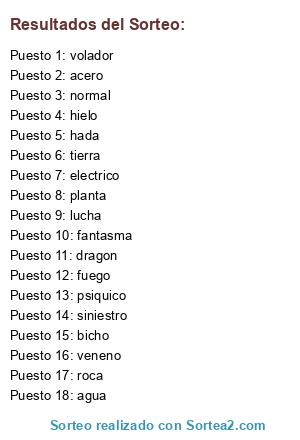 Lista de participantes: bicho, planta, fuego, psiquico, agua, fantasma, normal, lucha, siniestro, volador, roca, tierra, acero, electrico, dragon, hielo, hada, veneno, .