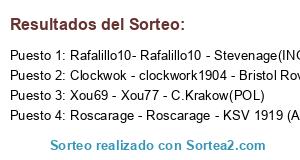 Lista de participantes: Clockwok - clockwork1904 - Bristol Rovers(ING), Roscarage - Roscarage - KSV 1919 (AUSTRIA), Xou69 - Xou77 - C.Krakow(POL), Rafalillo10- Rafalillo10 - Stevenage(ING).