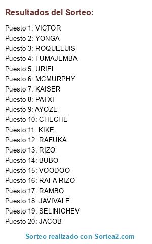 Lista de participantes: RAFUKA, SELINICHEV, AYOZE, BUBO, CHECHE, FUMAJEMBA, JACOB, JAVIVALE, MCMURPHY, PATXI, RAFA RIZO, RAMBO, RIZO, ROQUELUIS, URIEL, VICTOR, VOODOO, YONGA, KIKE, KAISER.