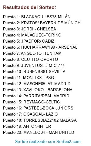 Lista de participantes: JPADFOR/ CADIZ, KRATOS/ BAYERN DE MÚNICH, PARRITA/REAL MADRID, HUCHARRAWY99 - ARSENAL, TORRESDIAZ2102 MÁLAGA, JORDI - CHELSEA, REYMAGO-CELTIC, XAVILOKO - BARCELONA, ANGEL-TOTTENHAM, PASTBEL-BOCA JUNIORS, MASCHE05- AT. MADRID, OGASGAL- LAZIO, RUBENSS81-SEVILLA, MONTIXX - PSG, MALAGUEO-TORINO, MANELO04 - MAN UNITED, ANTON-INTER, BLACKAQUILES78-MILÁN, CEUTITO-OPORTO, JUVENTUS--J-M-C-777.