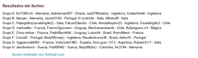 Lista de participantes: KendoKaponi23 - Inglaterra, Maty98(tito) - Colombia, N icodchile - Italia, foggiercrab8061 - Francia, RubenUC17 - Italia, Guru guru 1313 - Argentina, alevibreitonn - Suecia, Maty98(maty) - Inglaterra, fabiaan - Alemania, PabloBlack666 - Uruguay, CirosxD - Portugal, Osvaldirigillo2 - Chile, FrancoOgiovanni - Uruguay, Pabl06942 - Suecia, Alfredufff - Italia, defso10 - Portugal, Luzon04 - Brasil, MartLewandowski - Chile, Vic2184 - Alemania, RorroMessi - Francia, Chivo striker - Francia, Recalledcurve38 - Brasil, ColderNote8 - Inglaterra, nax0789(seba) - Inglaterra, Pepegrilloz(osvaldirigillo2) - Italia, JavierD10S - Portugal, FalconElitexXx - Chile, markoalbo - Francia, Italohernan007 - Ghana, Victorzote1982 - España, Xx7OMYxX - Alemania, Bullanguero mf - Bélgica.