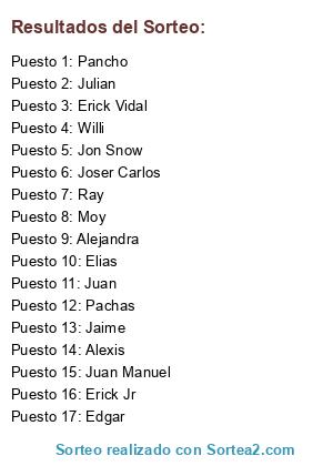 Lista de participantes: Erick Vidal, Erick Jr, Jaime, Edgar, Alejandra, Joser Carlos, Elias, Pachas, Willi, Moy, Pancho, Juan Manuel, Ray, Julian, Alexis, Juan, Jon Snow.