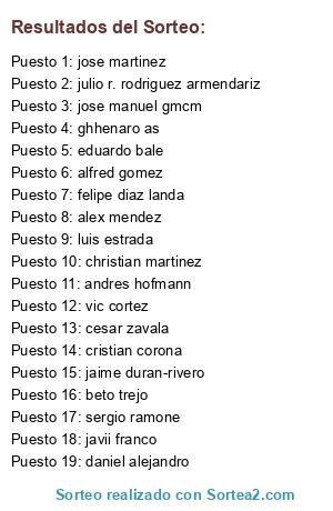 Lista de participantes: jaime duran-rivero, christian martinez, alfred gomez, felipe diaz landa, ghhenaro as, vic cortez, jose manuel gmcm, andres hofmann, alex mendez, javii franco, sergio ramone, eduardo bale, julio r. rodriguez armendariz, beto trejo, cristian corona, luis estrada, daniel alejandro, cesar zavala, jose martinez.
