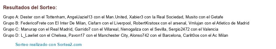 Lista de participantes: Carlit0os con el Ac Milan, Alonso742 con el Barcelona, Manurap con el Real Madrid, Vmlujan con el Atletico de Madrid, Dester con el Tottenham, FedericoFrete con El Inter De Milan, Pavon17 con el Manchester City, AngelJaziel13 con el Man.United, RobertKratosx con el arsenal, L_Lawliet con el Chelsea, Sergio2472 con el Valencia, Garrido7 con el Villareal, Cisfarn con el Liverpool, Xabier3 con la Real Sociedad, Musito con el Getafe, Nenogaliza con el Sevilla.