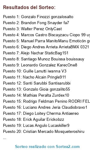 Lista de participantes: Lucas Angulo Lucaskiller9, Diego Andres Arrieta ArrietaBMX 0321, Brandon Fong Snayder fa7, Mathias Peralta Zurdex10, Nacho Alcain Pringle911, Manuel Parra ManitoManu Emoticón grin, Rodrigo Feldman Penino RODRI FELDMAN 7, Santiago Munoz Bouissa bouissauy, Diego Loitey Cherma Antiaereo, Luciano Andres Jeria Claudiobravo1, Gonzalo Finozzi gonzalosalto, Alejo Nachar StaticBag151, Santi Sarubbi Santisarubbi, Emanuel Ortiz Dean Ortiz, Walter Perez OnlyCast, Gonzalo Gioia gonzalito55, Marcos Castro Biscayzacu Ciopo 99 uy, Erick Aguilar Erickobzz, Cristian Mercado Mosqueteroshiru, Guille Lanutti iwanna V3, Leonardo Gonzalez KarecOne8.