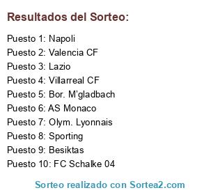 Lista de participantes: Liverpool, Spurs, Zenit, Napoli, Olym. Lyonnais, Roma, Valencia CF, VfL Wolfsburg, Inter, Everton, Lazio, FC Porto, Sevilla FC, SL Benfica, FC Schalke 04, Real Sociedad, Milan, Athletic Bilbao, Bayer 04, AS Monaco, Fenerbahçe, Sporting, CSKA Moskva, Besiktas, Swansea City, Fiorentina, Villarreal CF, Southampton, Bor. M’gladbach, Galatasaray.