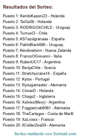 Lista de participantes: KendoKaponi23 - Holanda, llColderZeaDll - Alemania, Xalvixx(Mery) - Argentina, RubenUC17 - Argentina, Foggiercrab8061 - Alemania, CirosxD - Holanda, XaLvixxx - Francia, TheCartagos - Costa de Marfil, RODRIGOXCHILE - Uruguay, TurnuxCl - Chile, Chago2 - Inglaterra, Kytox - Portugal, TaiGa56 - Holanda, AS7azulgranaaa - España, Alevibreitonn - Nueva Zelanda, FrancoOGiovanni - Italia, Ryougamaster - Alemania, BenjaChile - Suecia, PabloBlack666 - Uruguay, Stretchycrane14 - España.
