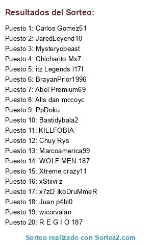 Lista de participantes: Chuy Rys, Chicharito Mx7, JaredLeyend10, Xtreme crazy11, itz Legends l17l, Alls dan mccoyc, Abel Premium69, wicorvalan, KILLFOBIA, BrayanPrior1996, Carlos Gomez51, Mysteryobeast, Juan p4bl0, x7zD IkoDruMmeR, R E G I O 187, xStiivi z, Marcoamerica99, WOLF MEN 187, Bastidybala2, PpDoku.