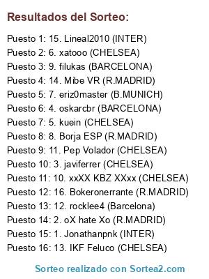 Lista de participantes: 1. Jonathanpnk (INTER), 2. oX hate Xo (R.MADRID), 3. javiferrer (CHELSEA), 4. oskarcbr (BARCELONA), 5. kuein (CHELSEA), 6. xatooo (CHELSEA), 7. eriz0master (B.MUNICH), 8. Borja ESP (R.MADRID), 9. filukas (BARCELONA), 10. xxXX KBZ XXxx (CHELSEA), 11. Pep Volador (CHELSEA), 12. rocklee4 (Barcelona), 13. IKF Feluco (CHELSEA), 14. Mibe VR (R.MADRID), 15. Lineal2010 (INTER), 16. Bokeronerrante (R.MADRID).