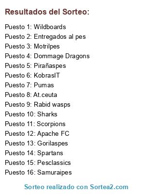 Lista de participantes: Entregados al pes, Wildboards, Rabid wasps, Pesclassics, At.ceuta, Motrilpes, Gorilaspes, Dommage Dragons, Samuraipes, Pumas, Sharks, Scorpions, Spartans, Pirañaspes, Apache FC, KobrasIT.