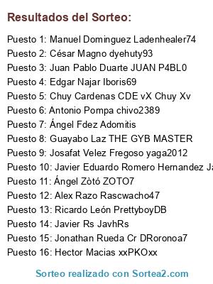 Lista de participantes: Ángel Zòtó ZOTO7, Alex Razo Rascwacho47, Manuel Dominguez Ladenhealer74, Ángel Fdez Adomitis, Chuy Cardenas CDE vX Chuy Xv, Ricardo León PrettyboyDB, Juan Pablo Duarte JUAN P4BL0, Javier Rs JavhRs, Javier Eduardo Romero Hernandez JavierRomero02, Edgar Najar Iboris69, César Magno dyehuty93, Hector Macias xxPKOxx, Guayabo Laz THE GYB MASTER, Antonio Pompa chivo2389, Josafat Velez Fregoso yaga2012, Jonathan Rueda Cr DRoronoa7.