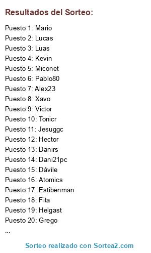 Lista de participantes: Agus, Atomics, Dávile, Dani21pc, Danirs, Estibenman, Fita, Franjviz, Frekky, Grego, Helgast, Hector, Jesuggc, Kevin, Luas, Lucas, Mario, Miconet, Pablo80, Tonicr, Victor, Waly, Xavo, Alex23.