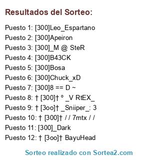Lista de participantes: [300]Apeiron, [300]Bosa, [300]_M @ SteR, † [300]† º _V RtEX_, † [3oo]† BayuHead, † [300]† / / 7mtx / /, † [3oo]† _Sniiper_: 3, [300]_Dark, [300]8 == D ~, [300]Chuck_xD, [300]B43CK, [300]Leo_Espartano.