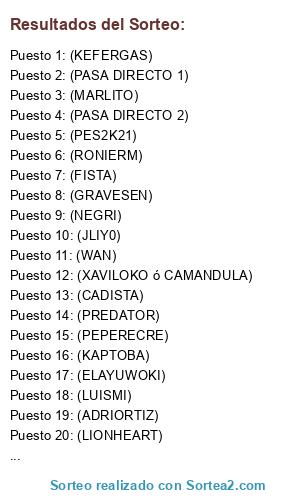 Lista de participantes: (ELAYUWOKI), (XAVILOKO ó CAMANDULA), (PEPERECRE), (LIONHEART), (MARLITO), (FISTA), (PREDATOR), (JLIY0), (NEGRI), (WAN), (EMILICH), (LUISMI), (CHULERIA), (CADISTA), (ADRIORTIZ), (PES2K21), (KAPTOBA), (JESURE), (PASA DIRECTO 2), (AYO), (WAKANDU), (PASA DIRECTO 1), (FRESCO), (RONIERM), (MANSINO), (DANIORLO), (KEFERGAS), (IVANCADUTI), (GRAVESEN), (GOAR_CAI), (PACONERO), (PASA DIRECTO 3).