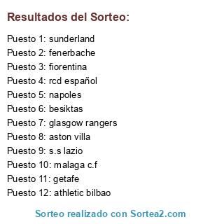 Lista de participantes: fiorentina, malaga c.f, aston villa, s.s lazio, glasgow rangers, besiktas, sunderland, rcd español, napoles, athletic bilbao, getafe, fenerbache.
