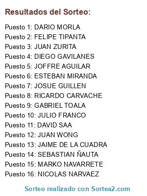 Lista de participantes: DARIO MORLA, DAVID SAA, DIEGO GAVILANES, ESTEBAN MIRANDA, FELIPE TIPANTA, GABRIEL TOALA, JAIME DE LA CUADRA, JOFFRE AGUILAR, JOSUE GUILLEN, JUAN WONG, JUAN ZURITA, JULIO FRANCO, MARKO NAVARRETE, NICOLAS NARVAEZ, RICARDO CARVACHE, SEBASTIAN ÑAUTA.