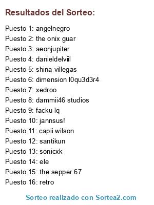 Lista de participantes: aeonjupiter, angelnegro, capii wilson, dammii46 studios, danieldelviil, dimension l0qu3d3r4, ele, facku lq, jannsus!, retro, santikun, shina villegas, sonicxk, the sepper 67, the onix guar, xedroo.