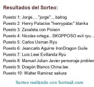 Lista de participantes: Nicolas ortega...SKGPPOSO evil ryu..., Jeancarlo Aguirre IronDragon Guile, Jorge.... "jorge"....balrog, Walter Ramirez sakura, Manuel Julian Javier personaje problema, Henry Palacios "henrypalac" blanka, Luis Lewi Evillanda Ryu, Carlos Usman Ryu, Dragón Blanco China lee, Zavaleta con Poison.