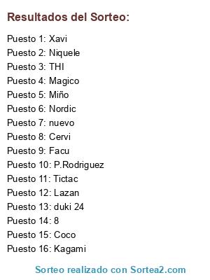 Lista de participantes: 8, Cervi, Coco, duki 24, Facu, Kagami, Lazan, Magico, Miño, Niquele, Nordic, nuevo, P.Rodriguez, THI, Tictac, Xavi.