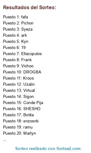 Lista de participantes: 19, Alto Perro, ark, bichi, Botita, Conde Pija, Cristiano, DROGBA, Ellacopulos, enzosnb, Facha, fafa, Fito, Frank, Hao, Kroos, Kyn, Martyn, Ozil, Pato.al.rington, Pichon, ramu, Redondo, shaka, Shecka, SHESHO, Sigon, Syeza, Tano, Uzalin, Vichoo, Virtual.