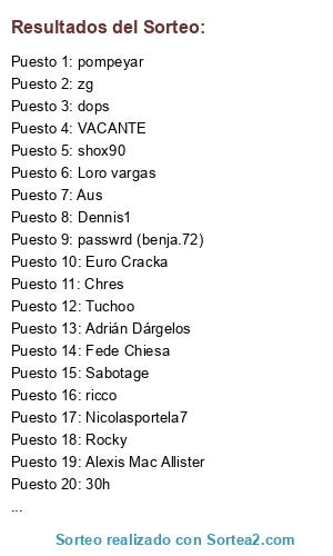 Lista de participantes: 30h, Adrián Dárgelos, Alexis Mac Allister, Atsumu, Aus, Chres, Dennis1, Dinoch, dops, Euro Cracka, Fede Chiesa, hy., Kaos, Klose, Loro vargas, mate, Morata, nbl, Nicolasportela7, passwrd (benja.72), pompeyar, Renzoc905, ricco, Rocky, Rukaard, Sabotage, shox90, VACANTE, Tuchoo, vinijr, Xaiterz, zg.