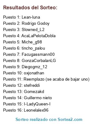 Lista de participantes: Facugassmann00, Guillermo nieto, stefreddi, AcaLaPelotaDobla, Miche_g98, tincho_palou, Gomezakd, GonzaCorbalanLG, oxjonathan, Lean-luna, Leonelalex96, Slowned_L2, I-LadyQueen-I, Diegogmz_12, Rodrigo Godoy, Reemplazo (se acaba de bajar uno).